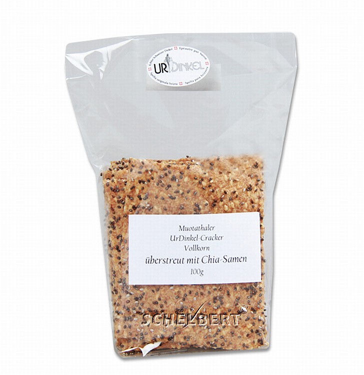 UrDinkel-Zertifizierung: ProCert; Zutaten: UrDinkel-Vollkornmehl, Sesamen 11%, Cashewkerne 6%,Olivenöl, Meersalz, Chia-Samen 3%; 100g enthalten: 1630kJ, 14g Eiweiss, 49g Kohlenhydrate, 18g Fett Lagerung: kühl, trocken Zusatzinformationen